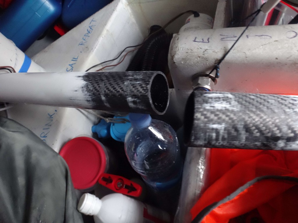 On board I had a “Composite Patch” repair kit, which I still had from my 2013 Transat campaign. I was incredible impressed with the pack, it contained a piece of carbon, which was vacuum-sealed in the same pack as the two part epoxy. Using a flat spatula you could break the seal between the two-part epoxy and mix the two, without getting your hands dirty. Then once mixed I could break the seal to the carbon fibre piece and let it soak up the epoxy. Once I was ready I could cut open the pack and directly apply it to my spinnaker pole. All was looking good – I had the pole inside and tied to the boat as not to move, and try keep it straight. With slight apprehension that actually once I’d fixed it if I could push it forward enough to get it out the hatch again…!